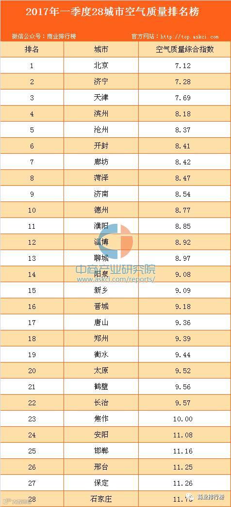 从榜单来看,2017年一季度,北京位居“2+26”城市环境空气质量综合指数榜首,而山东各城市的表现则更好:济宁(7.28)排名第2,滨州(8.15)第4位,菏泽(8.47)排名第8位,济南(8.54)排名第9位,德州(8.77)排名第10位,淄博(8.92)第12位,聊城(8.97)第13位。