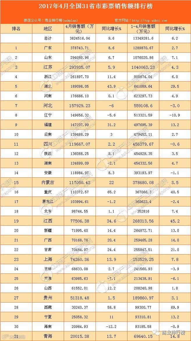 1-4月累计,与上年同期相比,全国共有23个省份彩票销售量出现增长。其中,湖北、重庆、江西、山东和福建增加额较多,同比分别增加14.62亿元、10.59亿元、8.36亿元、7.10亿元和5.81亿元。