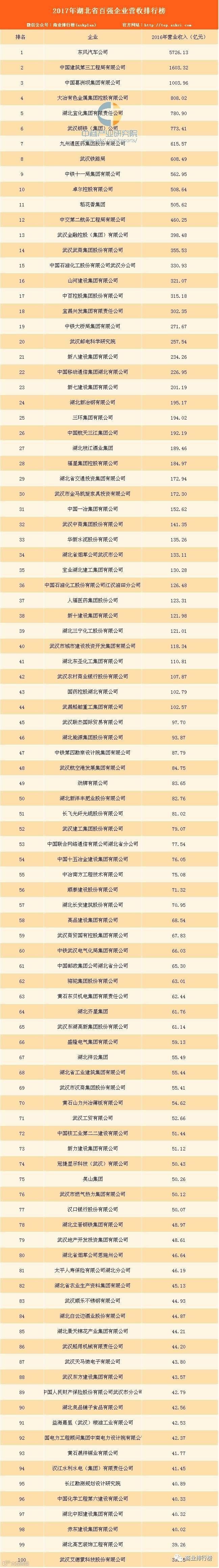 日前,湖北省企业联合会、湖北省企业家协会以2016年的企业营业收入为入围标准发布了企业百强排行榜。