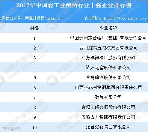 近日,2017年中国轻工业酿酒行业十强企业排行榜出炉。据榜单显示:2017年中国轻工业酿酒行业十强企业分别为:中国贵州茅台酒厂有限责任公司、四川宜宾五粮液集团有限公司、江苏洋河酒厂股份有限公司、泸州老窖股份有限公司、青岛啤酒股份有限公司、山西杏花村汾酒集团有限责任公司、劲牌有限公司、会稽山绍兴酒股份有限公司、安徽古井集团有限责任公司和烟台张裕集团有限公司。