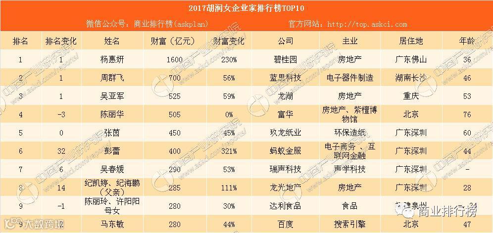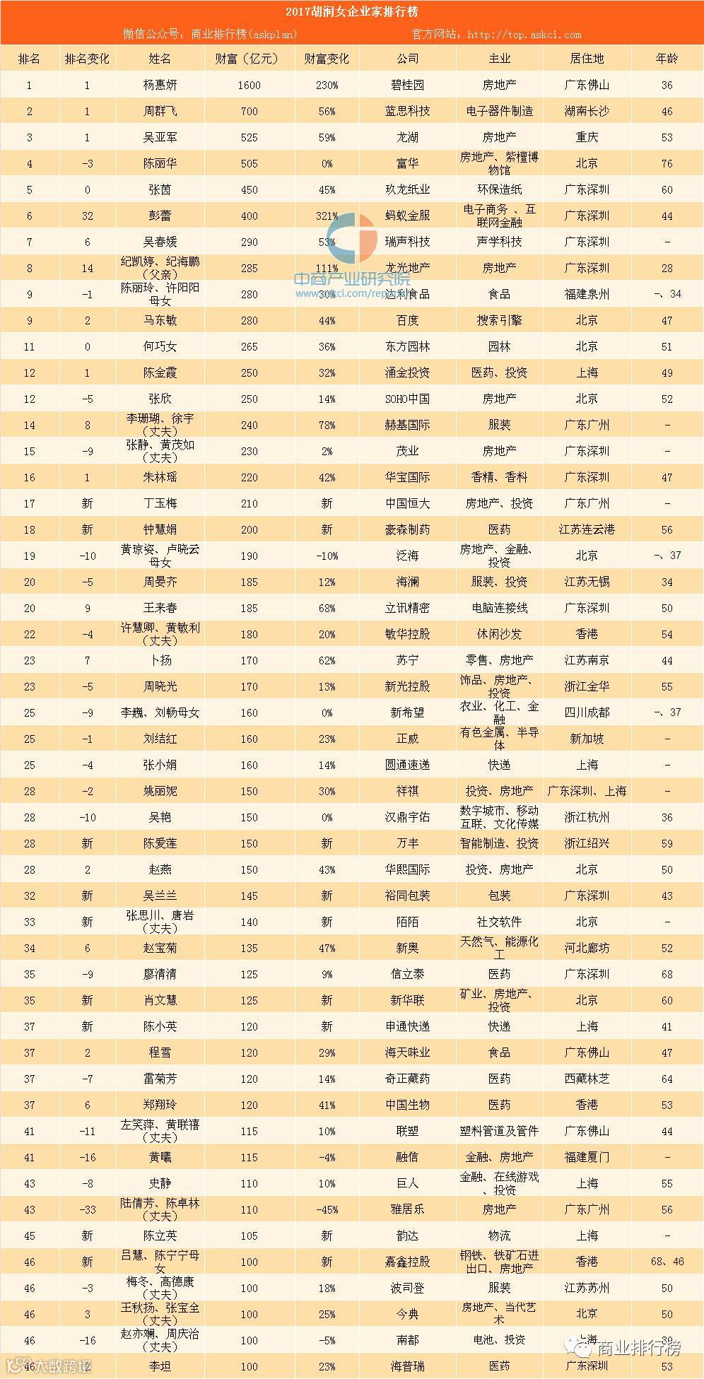 36岁杨惠妍以财富1600亿元继2014年之后第五次成为中国女首富;“触屏女王”46岁周群飞以700亿元排名第二,而第二次成为全球白手起家女首富;前女首富53岁吴亚军以525亿元排名第三;去年女首富76岁陈丽华以505亿元居第四。