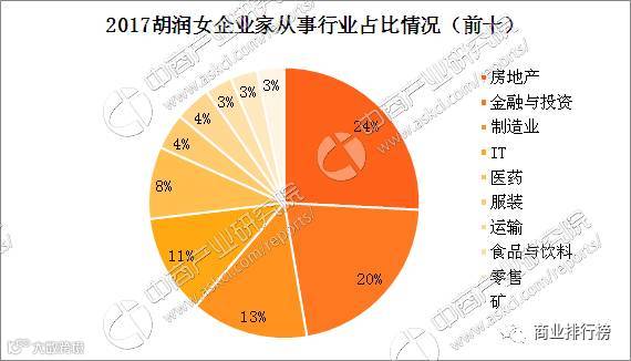 房地产和金融投资是最多上榜女企业家所从事的行业,分别占比24%和20%,比例都呈上升趋势,尽管与胡润百富榜总榜上制造业占比最高有所不同,女企业家中最成功的白手起家首富也来自制造业。胡润表示:“对比前50名男企业家,房地产和金融投资也是男企业家最主要的财富来源,差距较大是在IT行业。”