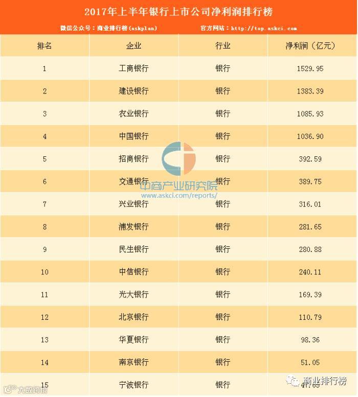 整体来看,银行行业15家上市企业中,上半年营收超千亿元的企业有6家;15家企业上半年营收均超百亿。而净利润上半年超千亿的企业有四家,依次为工商银行、建设银行、农业银行、中国银行。以下为2017年上半年银行行业上市公司净利润排名情况: