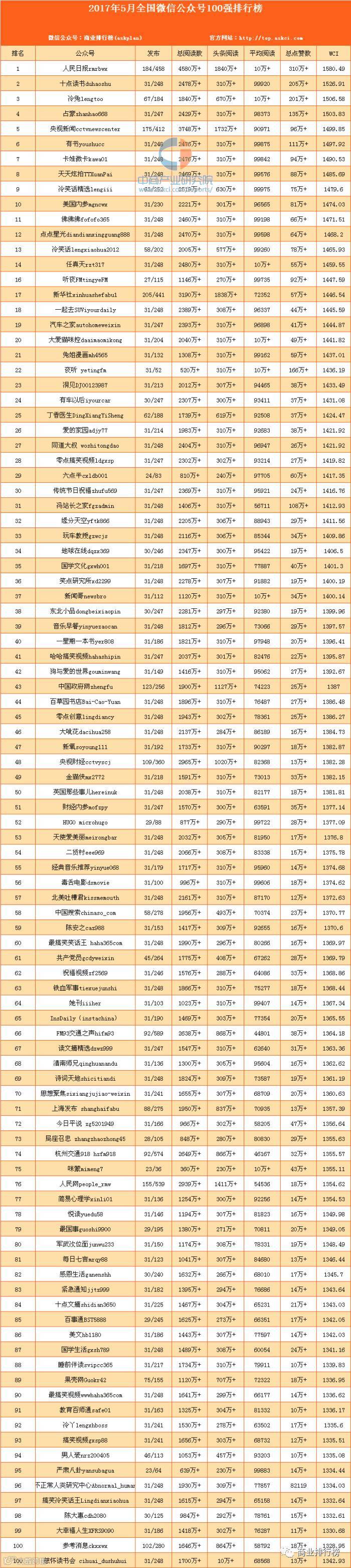 2017年5月全国微信公众号100强排行榜名单已经出炉了。据清博指数数据统计数据显示:5月前十的公众号分别是人民日报、十点读书、冷兔、占豪、央视新闻、有书、卡娃微卡、天天炫拍、冷笑话精选和美国内参。其中,人民日报、十点读书稳居第一和第二名。上月排名第三的央视新闻,本月跌至第五名。本月冷笑话精选重回前十,佛佛佛跌出前十,排名第11位。本月排名第一的人民日报,总阅读数为4580万+,头条月度1840万+,平均阅读10万+,总点赞数310万+,WCI为1580.49。