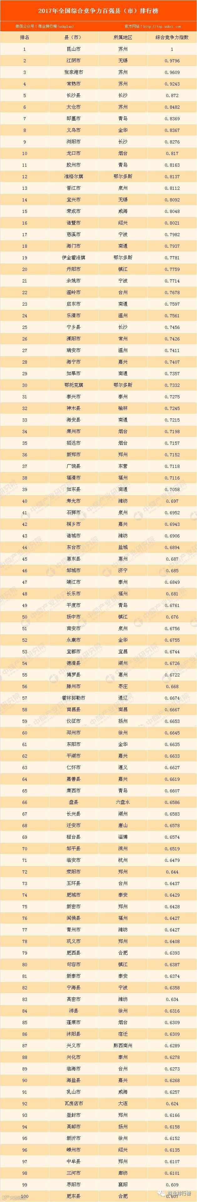 2017年全国综合竞争力百强县(市)前十排名分别是:昆山市、江阴市、张家港市、常熟市、长沙县、太仓市、即墨市、义乌市、浏阳市和龙口市。其中,江苏省占据五席,湖南和山东各占两席,浙江占1席。广东县市无缘前十。