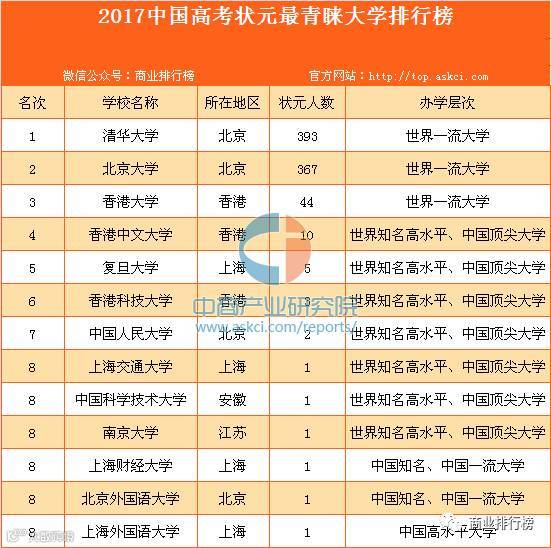 报告显示,在2007-2016年中国各地区高考状元中,清华大学录取的高考状元人数最多,有393人,跃居校友会2017中国高考状元最青睐大学排行榜榜首;北京大学367人,屈居第2;两校录取的高考状元占全国总数的91.46%,成为最近10年来中国最受高考状元青睐的大学。香港大学44人,居第3;香港中文大学10人,列第4;复旦大学5人,居第5;香港科技大学有3人,列第6;中国人民大学2人,居第7;中国科学技术大学、上海交通大学、南京大学、上海财经大学、北京外国语大学、上海外国语大学各1人,并列第8。