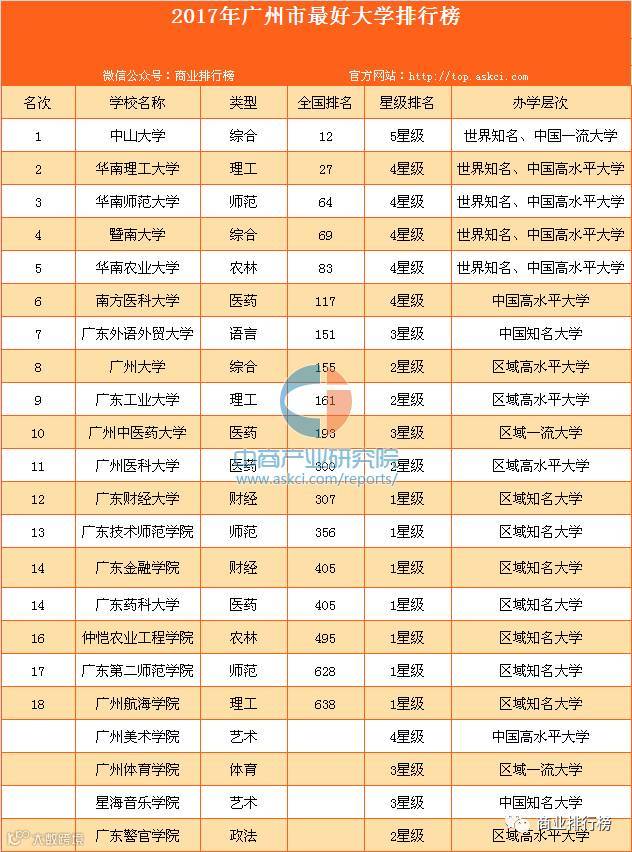 根据艾瑞深中国校友会网最新发布2017广州市最好大学排行榜显示,中山大学、华南理工大学、华南师范大学、暨南大学、华南农业大学、南方医科大学、广东外语外贸大学、广州大学、广东工业大学、广州中医院大学雄居校友会2017广州市最好大学排行榜前10强。