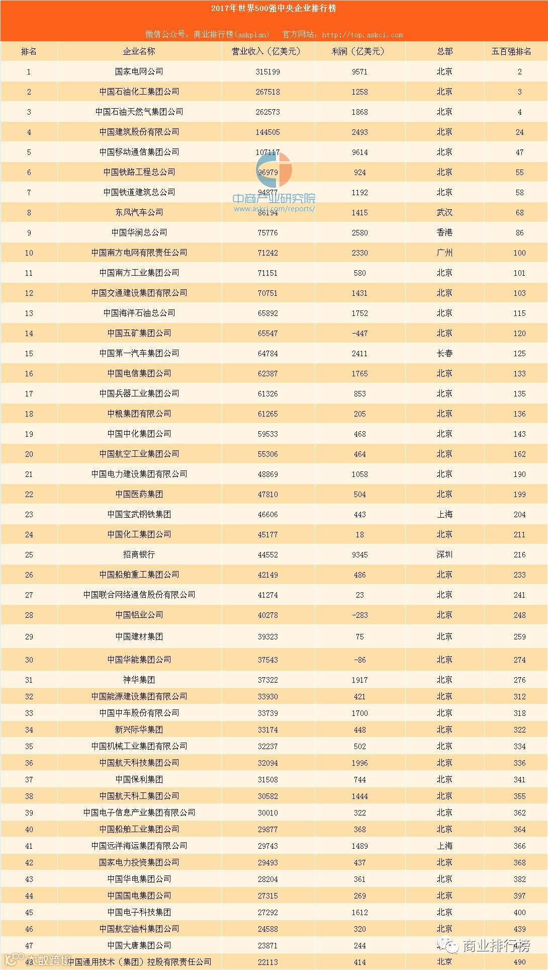 115家上榜中国企业营收总计63165.47亿美元,其中48家央企营收总计31305.89亿美元,央企占比49.56%。2017年上榜的48家央企利润总计693.16亿美元,平均利润为14.44亿美元。值得一提的是,中国移动,营收排名47,利润却略超过国家电网的95.71亿美元,达到96亿美元。