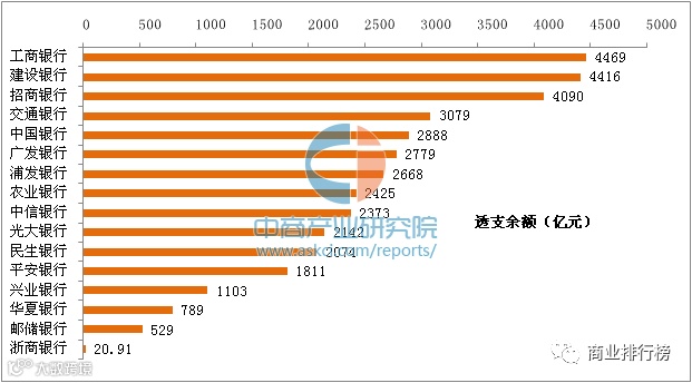 榜单显示,2016年全国性银行信用卡透支余额排名前三的依次是工行、建行、招行,其中,工行2016年信用卡透支余额达到4469亿元,居于榜首,建行第2,信用卡透支余额达到4416亿元。