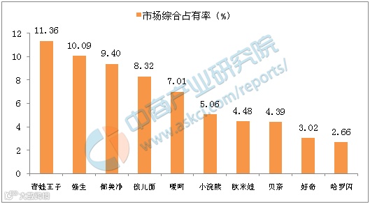 中商产业研究院发布的《2017-2022年中国儿童护肤品行业市场调查及投资前景研究报告》指出,2015年,我国儿童护肤品行业市场份额排名前十品牌分别为:青蛙王子、强生、郁美净、孩儿面、嗳呵、小浣熊、欧米娃、贝亲、好奇和哈罗闪。从品牌监测情况来看,青蛙王子、强生和郁美净为最热销的三大品牌,儿童护肤品市场前十品牌市场占有率达66%左右,市场集中度较高。