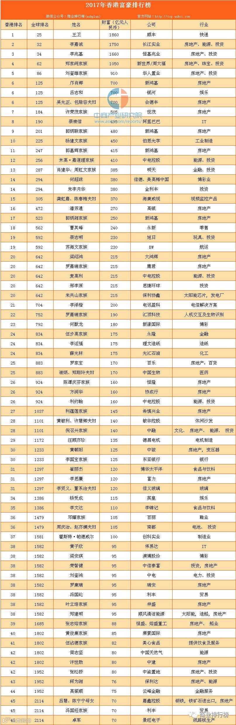 根据胡润研究院发布的《2017胡润全球富豪榜》,中商产业研究院梳理出2017年香港富豪排行榜,详细榜单如下。