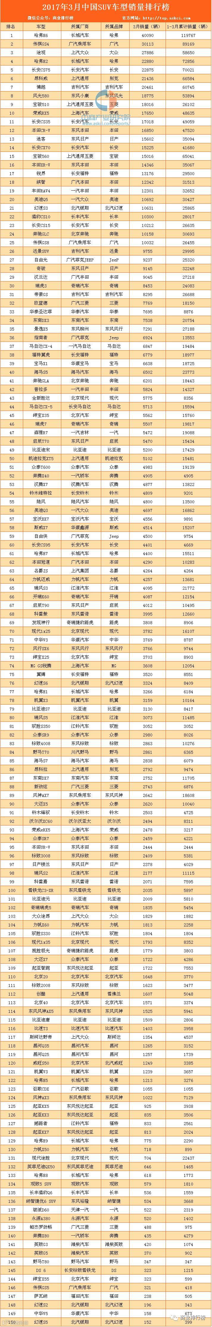 2017年3月SUV市场中,最畅销车型为依然为哈弗H6,销量为4万辆。