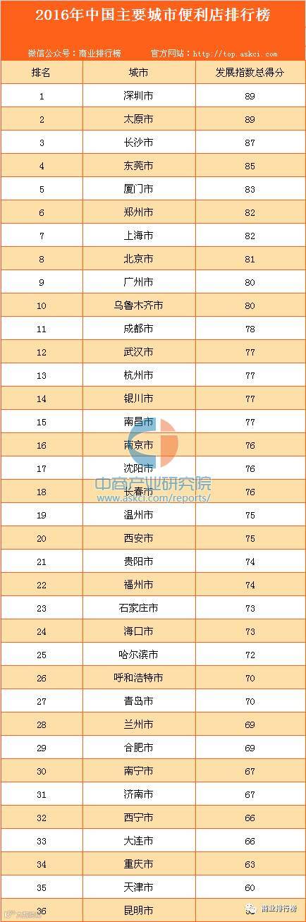2016年“城市便利店发展指数”调查的城市共计36个,涵盖大陆30个省会城市、直辖市,4个计划单列市和东莞、温州两个城市。指数的核心数据为连锁品牌化得便利店数量、便利店数量的增速、24小时便利店的比例及政策支持力度,在此基础上,统计计算出了各城市的便利店指数。