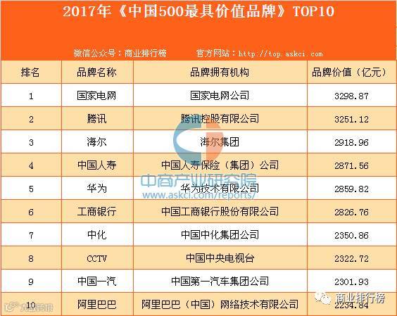 此外,排在榜单前十的还有腾讯(3251.12亿元)、海尔(2918.96亿元)、中国人寿(2871.56亿元)、华为(2859.82亿元)、工商银行(2826.76亿元)、中化(2350.86亿元)、CCTV(2322.72亿元)、中国一汽(2301.93亿元)和阿里巴巴(2234.84亿元),它们都是中国的国民品牌,同时也都迈进了世界级品牌阵营。