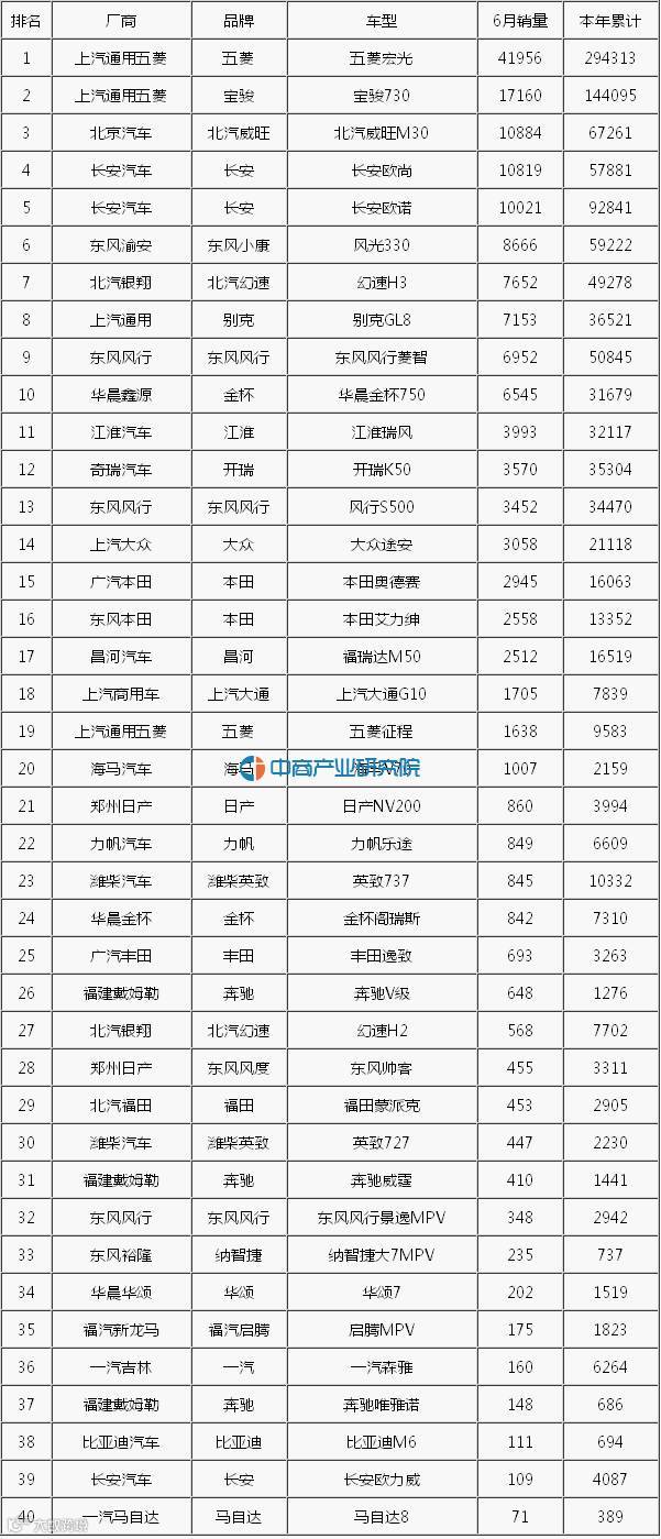 2016年6月MPV销量排行榜