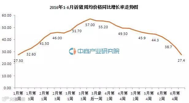 同比方面:活猪周均价格同比增长率由2016年1月第1周的27.3%一路上涨为3月第4周的57.0%,之后走向下降趋势,2016年6月第5周同比增长率为27.4%。