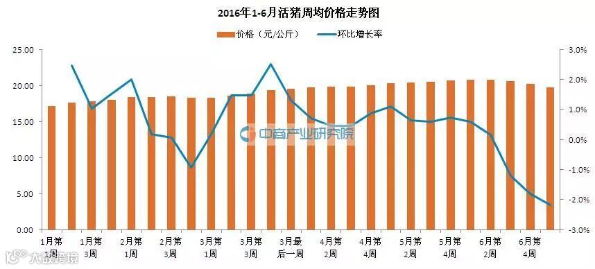 中商情报网讯,2016年6月第5周集贸市场活猪平均价格为19.74元/公斤,较上周均价减少2.2%,较去年同期上涨27.4%。2016年3月第4周以来,活猪价格环比增长率开始走向下降趋势,在6月第3周降为-1.2%,开始今年的第2次下跌(第一次下跌为2月第4周)。