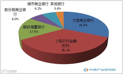 2015年,在金融机构营业网点分布中,小型农村金融机构以77889个营业网点占比35.3%;大型商业银行营业网点数量为69293个,占比34.1%;邮政储蓄银行占比17.5%。