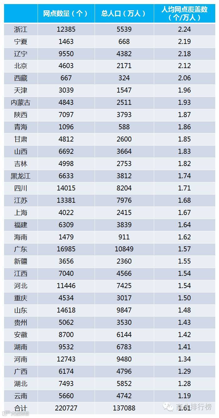 2015年中国金融机构人均网点区域排名榜