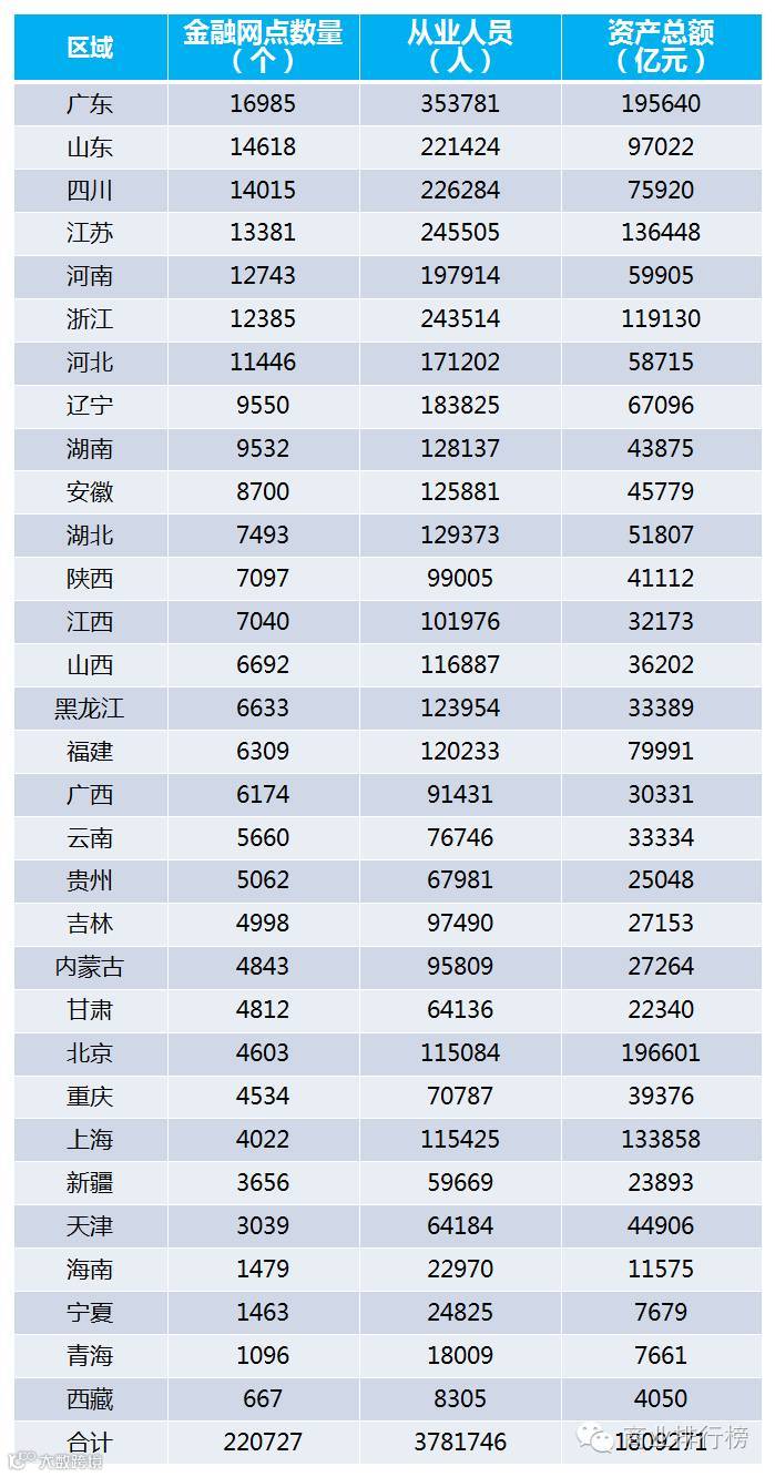2015年,我国金融机构营业网点达到22.07万个,从业人员378.17万人,资产总额合计为2.39万亿元。区域金融机构网点在5000个以上的占总体的61.3%,金融机构网点超过10000个有8个省区,主要是经济大省和人口大省。其中,广东省和山东省既是经济大省又是人口大省;四川省、河南省及河北省是人口大省,江苏省和浙江省是经济大省。