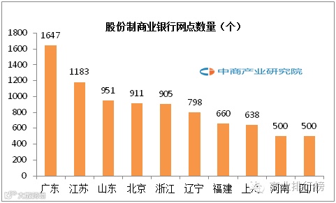 2015年,大型商业银行营业网点数量和股份制商业银行网点数量排名前三位的均为广东省、江苏省及山东省。城市商业银行网点分布中,超过500个营业网点的有9个地区,其中辽宁省和浙江省分别以1332、1233个营业网点位居第一、第二。