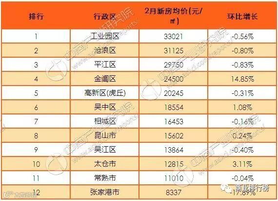 2017年2月苏州各区市县新建住宅成交均价排行榜