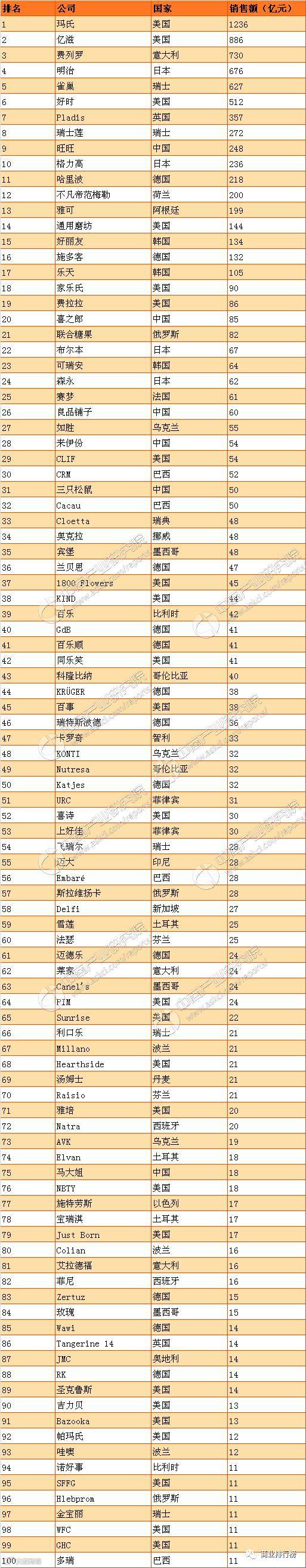 国外网站candyindustry发布一份2017全球100强糖果零食公司的排名榜单。