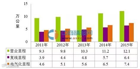 数据显示:2015年末全国铁路营业里程达到12.1万公里,比上年末增长8.2%。其中,高铁营业里程超过1.9万公里,西部地区营业里程4.8万公里、增长10.1%。路网密度126公里/万平方公里,比上年增加9.5公里/万平方公里。其中,复线里程6.4万公里、增长12.5%,复线率52.9%、比上年提高2.1个百分点;电气化里程7.4万公里、增长12.9%,电化率60.8%、比上年提高2.5个百分点。