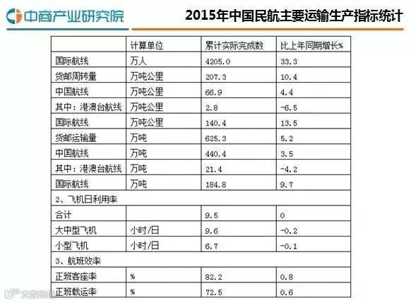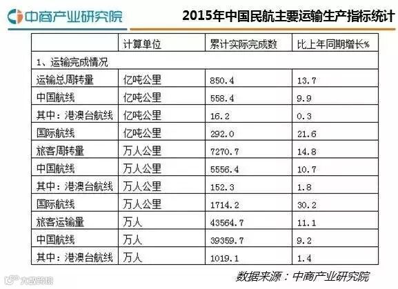 民航局统计的资料显示,2015年,民航运输总周转量850.4亿吨公里,同比增长13.7%。中国航线完成运输周转量558.4亿吨公里,增长9.9%,其中港澳台航线完成16.2亿吨公里,增长0.3%;国际航线完成运输周转量292.0亿吨公里,同比增长21.6%。旅客运输量43564.7万人,同比增长11.1%;货邮运输量625.3万吨,同比增长5.2%。正班客座率82.2%,同比增长0.8%。