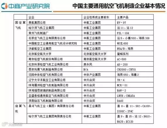 通用航空飞机分为固定翼飞机和旋翼飞机,中国飞机制造商多而不强,除了中航工业集团具有自主研发、自有知识产权外,大部分合资企业只是通过转包在中国进行组装和零部件生产,较少掌握核心技术。