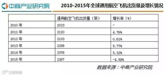 据通用航空制造商协会(GAMA)2016年3月公布的数据显示,2015年通航飞机交付量为2267架,总销售额为209亿美元,与2014年218亿美元的销售额相比下滑了4%。2016年第一季度,通航飞机交付总量相比去年同期下降3.7%,收入总额下降9.5%。具体来看,一季度共交付422架飞机,价值39.74亿美元。