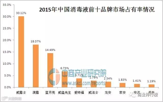 中商产业研究院发布的《2017-2022年中国消毒液行业市场调查及投资前景研究报告》指出,2015年,我国消毒液行业市场份额排名前十品牌分别为:威露士、滴露、蓝月亮、威猛先生、爱特福、威洁士、龙安、家安、安洁和开米。从品牌监测情况来看,威露士、滴露和蓝月亮为最热销的三大品牌,消毒液市场前十品牌市场占有率达83%左右,市场集中度较高。