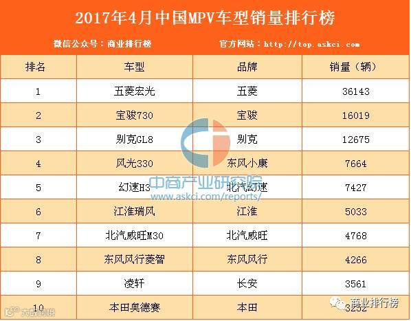 在MPV市场中,4月销量排名前十的车型依次为五菱宏光、宝骏730、别克GL8、风光330、幻速H3、江淮瑞风、北汽威旺M30、东风风行菱智、凌轩以及本田奥德赛。其中,排名第一的车型为五菱宏光,销量达36143辆。在上述这十款车型中,自主品牌车型占比过半。其中,五菱宏光是唯一一款销量超过3万辆的车型。