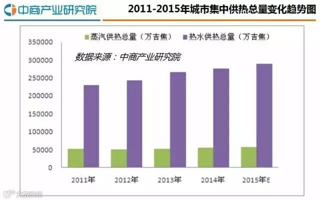 根据中商产业研究院大数据库显示,2014年,中国城市集中供热蒸汽供热总量为5.56亿吉焦,同比增长4.46%,热水供热总量达27.65亿吉焦,同比增长3.78%。2015年,中国城市集中供热蒸汽供热总量约为5.8亿吉焦,热水供热总量约为2.89亿吉焦。