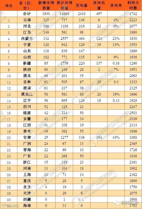2016年全国风电并网运行情况及新增并网容量排行榜