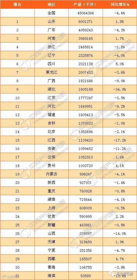 2016年全国各省市啤酒产量排行榜