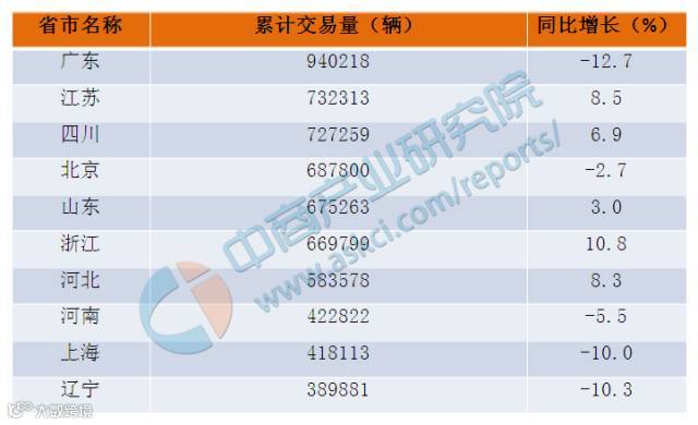 2015年,二手车交易量排在前10的区域市场如广东、北京、上海、河南和辽宁等5省市均出现负增长,主要原因是受“限购”加“限迁”双重负面因素的影响。