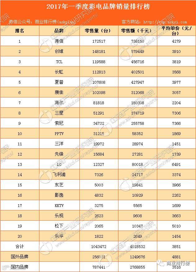 另据中怡康数据显示,一季度零售量排名前十的彩电品牌分别是海信、创维、TCL、长虹、夏普、康佳、海尔、三星、索尼和PPTV。