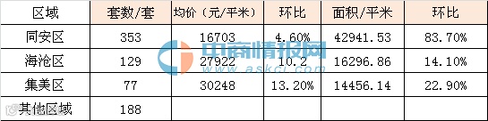 从区域看,上周同安区共成交353套、成交面积42941.53㎡,环比上涨83.7%,成交均价16703元/㎡,环比上涨4.6%;海沧区共成交129套、成交面积16296.85㎡,环比下跌14.1%,成交均价27922元/㎡,环比上涨10.2%;集美区成交77套、成交面积14456.14㎡,环比上涨22.9%,成交均价30248元/㎡,环比上涨13.2%。
