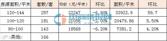 从房源面积看,上周120-144㎡面积段成交257套、成交面积33922.90㎡,环比上涨59.7%,成交均价22247元/㎡,环比下跌6.9%;100-120㎡面积段成交181套,成交面积为20479.86㎡,环比上涨5.5%,成交均价21056元/㎡,环比下跌2.0%;80-100㎡面积段成交143套、成交面积7381.20㎡,环比上涨4.2%,成交均价18568元/㎡,环比下跌6.2%。