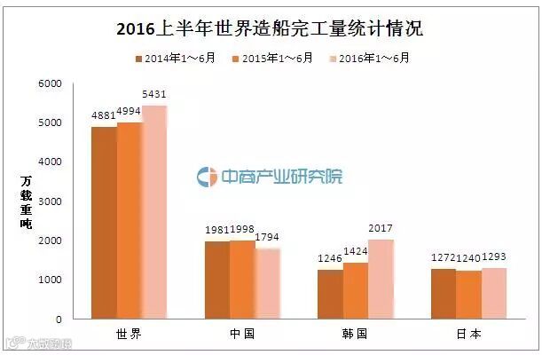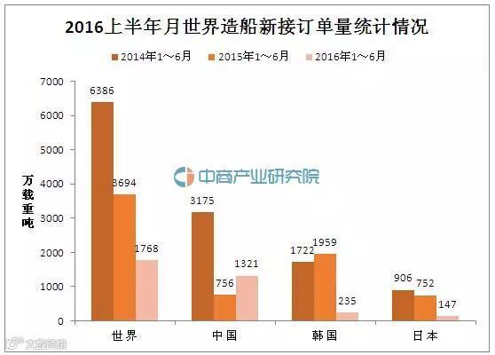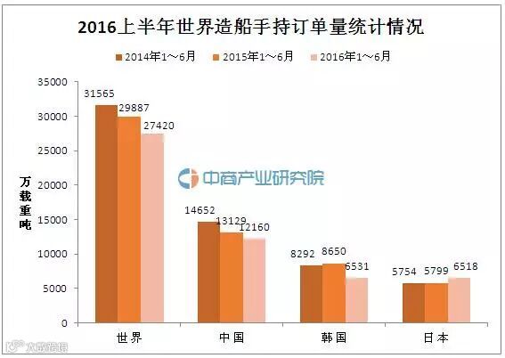 另外,2016年1-6月世界造船手持订单量27420万载重吨,其中,中国造船手持订单量达12160万载重吨,占比重44.3%。