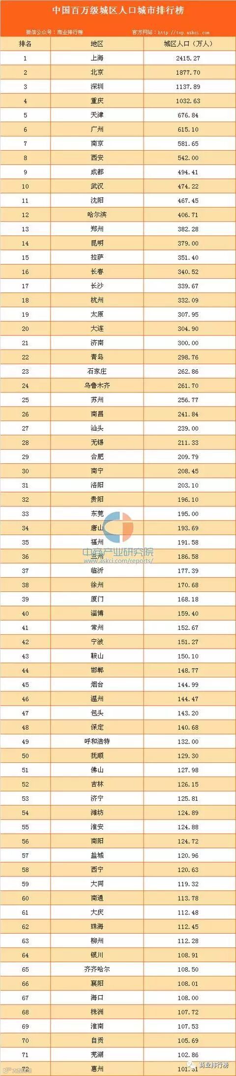 据中商产业研究院统计,2015年,中国百万级城区人口城市有72个,其中,千万级城区人口城市有4个,分别是上海、北京、深圳和重庆。百万级城区人口城市中,江苏省拥有最多,共有8个,分别是南京、无锡、徐州、常州、苏州、南通、淮安和盐城。