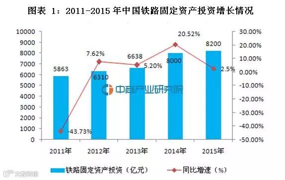 2015年是铁路“十二五”规划的收官之年。2015年全国铁路完成固定资产投资8200亿元人民币,新增铁路运营里程9000多公里,新开工61个项目。从2011年开始,中国铁路固定资产投资从5863亿元快速增长至8000亿元,其中较大比重投入到高速铁路领域,2016年铁路固定资产投资仍将保持8000亿规模。