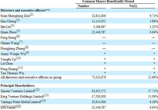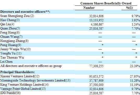 截止到2015年3月31日,邹胜龙持有32,814,606股,持股比例为9.79%;程浩持股13,133,952股,持股3.92%;IDG持有25,816,587股,持股比例为7.70%。