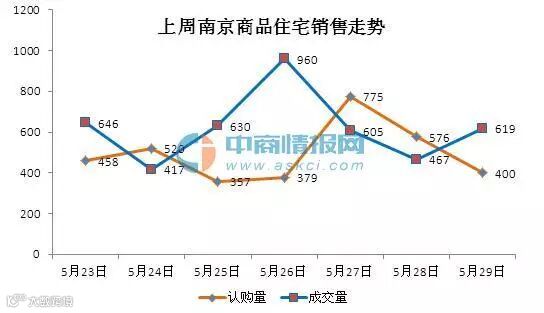 中商情报网讯:截止5月29日晚20:00,据网上房地产数据显示,上周(5月23日-5月29日)南京商品住房认购3465套,成交4344套,日均认购495套,日均成交621套,与上上周(5月16日-5月22日)相比,认购上升11%,成交上涨47.9%。