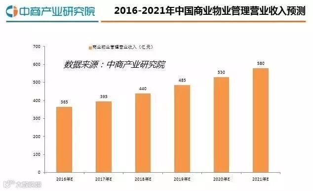 伴随着我国商业地产的蓬勃发展,我国商业物业管理行业发展空间巨大。中商产业研究院预测,到2021年,我国商业物业管理行业营业收入将达到580亿元。