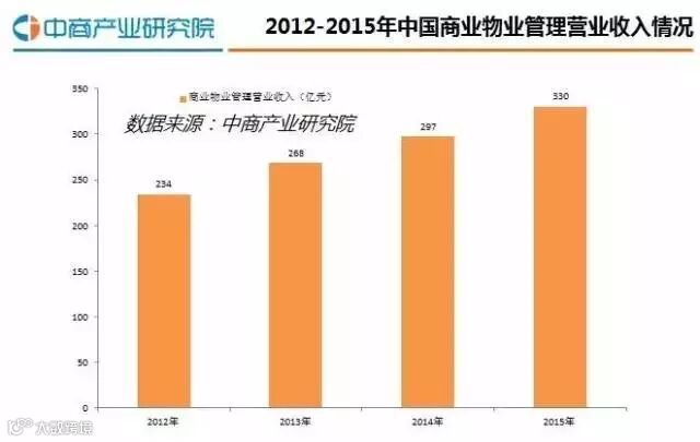 近年来,商业物业管理营业收入占比逐渐上升,2015年,中国商业物业管理营业收入约为330亿元,同比增长11.11%。