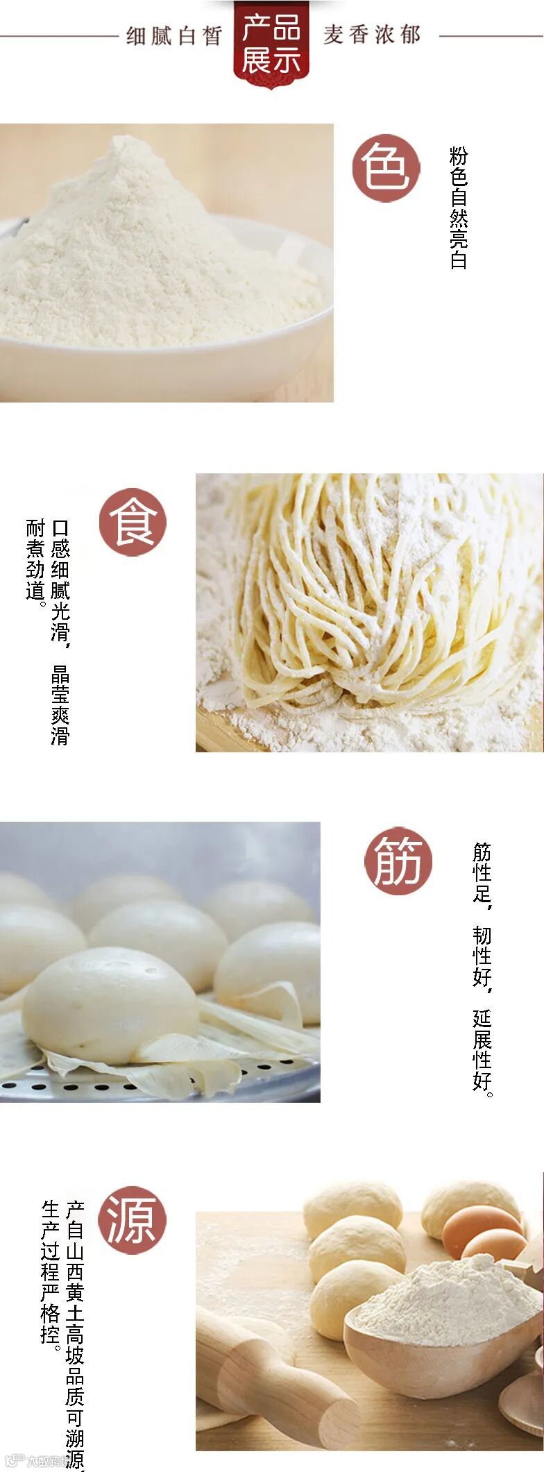 粉质洁白,麦香浓郁,制品晶莹爽滑,