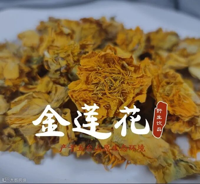 金莲花是五台山的土特产,生长在海拔二千米以上的阴湿高寒地带。据说,金莲花曾使辽国萧太后皮肤细白,故又被称为养颜金芙蓉,中药称“旱地莲花”,“旱荷花”。曾被列为皇宫贵族专用的名贵饮品,亦有御用“龙井”之称.它属于旱金莲种一年生草本植物.生长在五台山向阳的山坡、草地、林下。