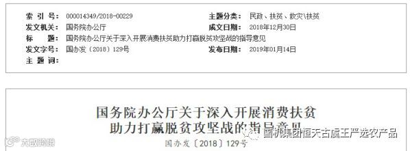 2019年1月14日,国务院办公厅发布了《关于深入开展消费扶贫助力打赢脱贫攻坚战的指导意见》,指出:消费扶贫是社会各界通过消费来自贫困地区和贫困人口的产品与服务,帮助贫困人口增收脱贫的一种扶贫方式,是社会力量参与脱贫攻坚的重要途径。为国机集团恒天古虞王开展消费扶贫提供了强有力的支持。